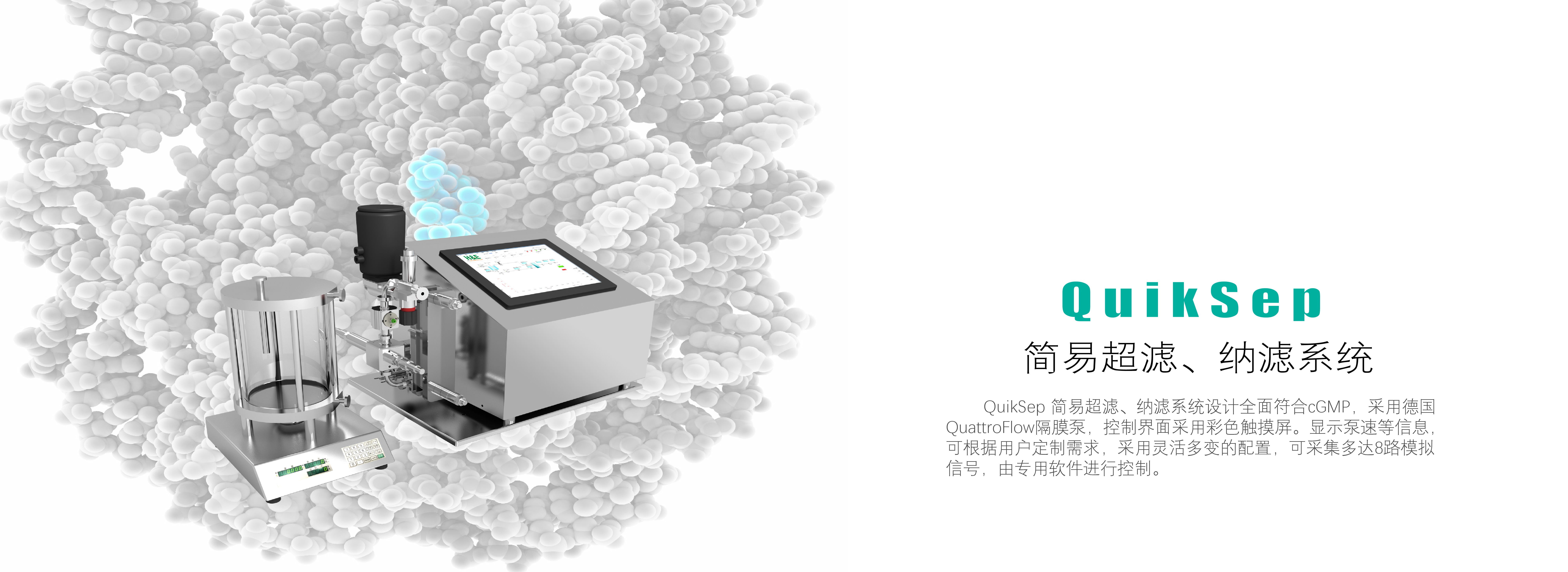 QuikSep IF桌面超濾系統是采用衛生級隔膜單泵作為循環輸液單元,在泵后、膜包濾過端和回流端分別配壓力傳感器,配合回流端的比例調節閥實現恒定跨膜壓TMP