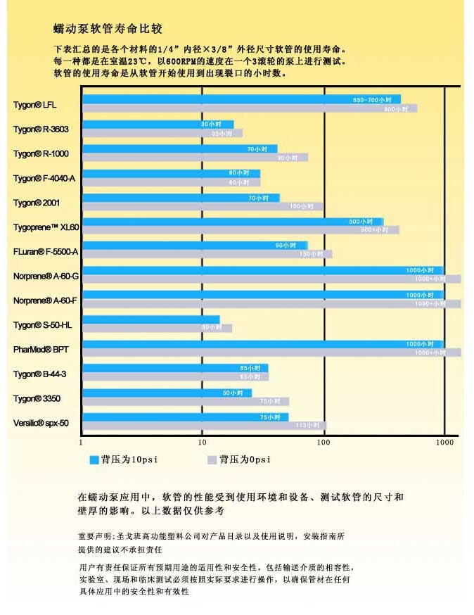 4、溫度:泵頭管不同材料有不同的溫度表現。有些管材如硅橡膠具有較寬溫度承受范圍,對高溫、低溫過程均適宜;而有些管材如Tygonˉ 及 C-Flexˉ則只適于某一較小的溫度范圍。最終用戶在選擇管材前,應先弄清系統中的最高溫度和最低溫度,然后確保所選泵管安全工作于此溫度區間。