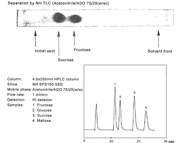 在使用NH MB 100-75/200SG填料之前最好做一下預(yù)實驗。以下是使用NH 薄層板和NH2 SPS 100-5SG做的預(yù)實驗。