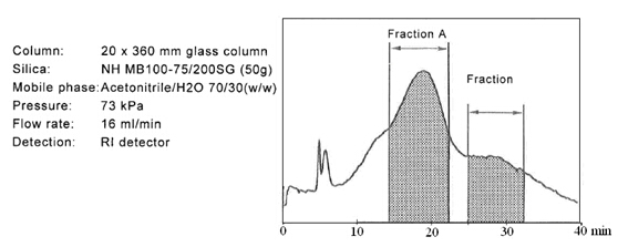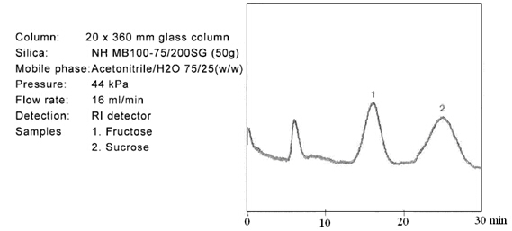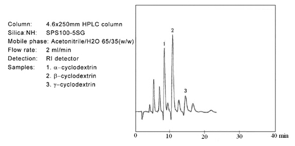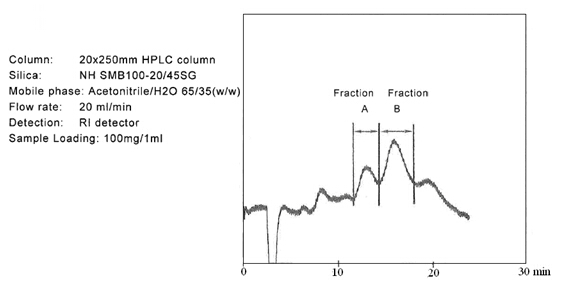 ? ? ? 糖類物質(zhì)的分析和制備,在液相色譜領(lǐng)域占有重要的地位。迄今為止,大多數(shù)的分離介質(zhì)僅僅局限在分析級別。但是富士硅膠研發(fā)出用于制備色譜的新的氨基硅膠。當使用高水相為流動相時,一般的氨基填料會暴露出很多問題。氨基硅膠的pH值很高,一般pH為9.0,在這樣高的pH條件下,目標化合物一般都會變性,并且會毀壞硅膠基質(zhì)的表面。考慮到這些問題,富士公司研發(fā)出新的氨基硅膠填料,稱之為NH SG硅膠。NH SG硅膠可以最小化甚至是避免上述問題,并且對糖類化合物進行更好的分離。