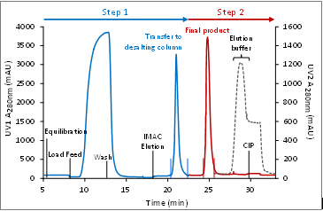 ??在該過程中,Protein A的洗脫組分不經過收集,而是在系統內直接上樣至脫鹽柱,兩步層析整合為一步,從而提高了純化效率。