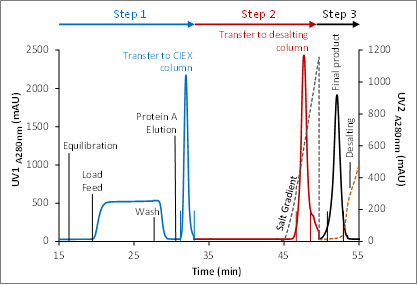 ??在該過程中,Protein A的洗脫組分經過在線稀釋,直接上樣至CIEX層析柱,CIEX進行線性洗脫,去除降解物及聚集體,將目標組分直接上樣至脫鹽柱。三步層析緊密銜接,前一步層析的洗脫與后一步層析的上樣同時進行,使得純化效率顯著提高。