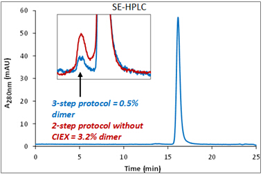??最終產品經SE-HPLC檢測,純度高達99.5%,二聚體含量僅為0.5%,比Protein A - Desalting兩步層析所得產品的二聚體含量降低近6倍,該產品可直接用于氨基酸序列測定、二硫鍵測定以及糖型分析等高純度要求的檢測。