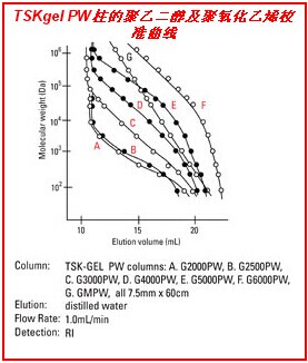 TSKgel PW柱由親水性球形聚甲基丙烯酸酯顆粒填充,粒度從12um(小孔徑柱)到17um(大孔徑柱)不等。PW柱的主要應用范圍在于分析水溶性聚合物,如纖維素、丙烯酰胺、二醇、葡聚糖、聚乙烯醇和低聚糖等。