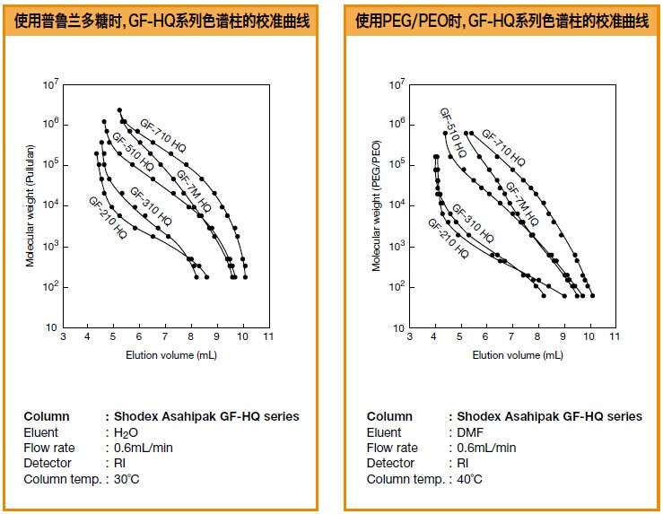 Asahipak GF系列色譜柱是具有良好的耐溶劑性的聚合物基質的水溶性/油溶性兩用SEC色譜柱,水和有機溶劑都適用。