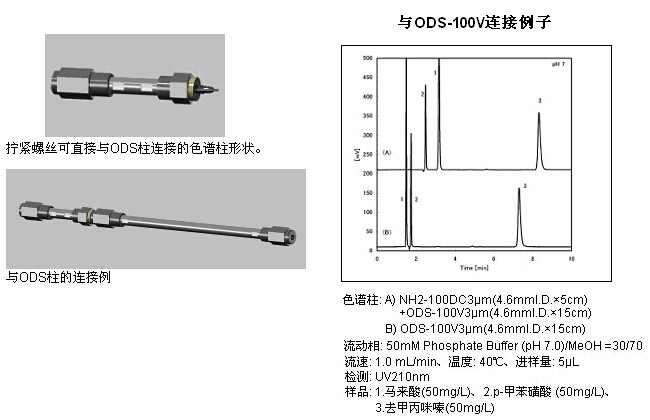 TSKgel NH2-100 DC 3μm 以鍵合了氨烷基的硅膠填料裝填了與后段的分析柱可以直接連接的色譜柱。不使用連接管也可連接2根色譜柱,可減少導致分離性能降低的死體積,2根分離模式不同的色譜柱的一體化,使用起來更方便。鍵合的氨基作為陰離子交換基發揮作用,協助完成后段色譜柱的分離,從而實現更好的分離成為可能。特別是與反相色譜柱的連接,醫藥品中的藥效成分和共存陰離子的同時分析成為可能。
