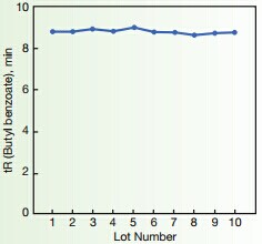 ??? 上圖顯示了疏水性作用的10批生產的批間再現性,這是色譜柱的基本參數,通過對生產過程的嚴格控制,獲得極穩定的批間再現性。其顯示了非常高的批次間重復性,在分析丁苯時候,以10批柱子的數據為例,保留時間的標準偏差小于1.5%,這數據大大低于普通的C18色譜柱。分析標準物質時,每根色譜柱的理論塔板數可達18600,壓力為2600psi。
