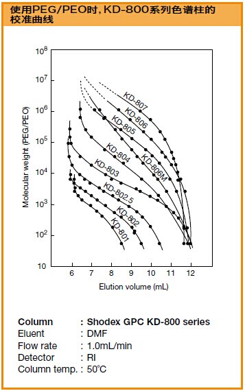 GPC KD-803是標準的油溶性SEC色譜柱,適用于從低分子量到高分子量的寬范圍的樣品。流動相是DMF。