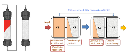 ??? ?? Capture SMB是將第一根層析柱的上樣流穿繼續上樣至第二根層析柱,待第一根層析柱完全滿載后,方結束其上樣,進行淋洗、洗脫等操作,而此時第二根層析柱仍在繼續上樣。通過切換柱位操作,保證2根層析柱的洗脫、再生、上樣等操作交替銜接進行,保證連續上樣,從而實現工藝與系統硬件設計的高度契合,使填料利用率最大化,用量大為縮減。