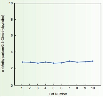 上圖所示,顯示了對羥基苯甲酸甲酯/2,6-二甲基吡啶(Methylparaben/2,6-Dimethylpyridine)YMC-Pack ODS-AM液相色譜柱上10次的分離因子(α)YMC公司在生產過程中采用的嚴格質量控制體系,以保證產品生產批間的差異最小,提供高再現性的堿性化合物分析柱。